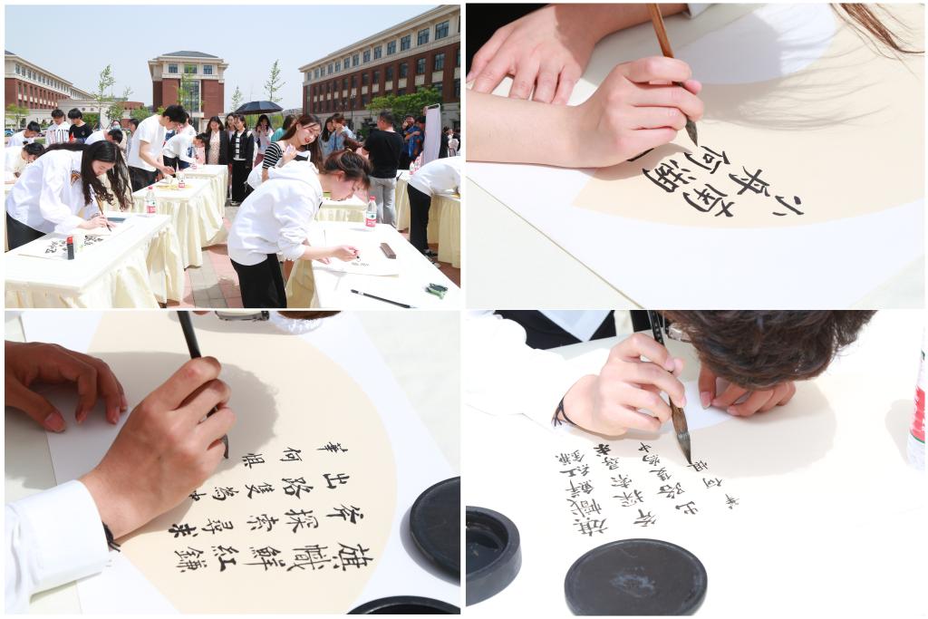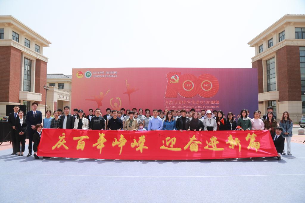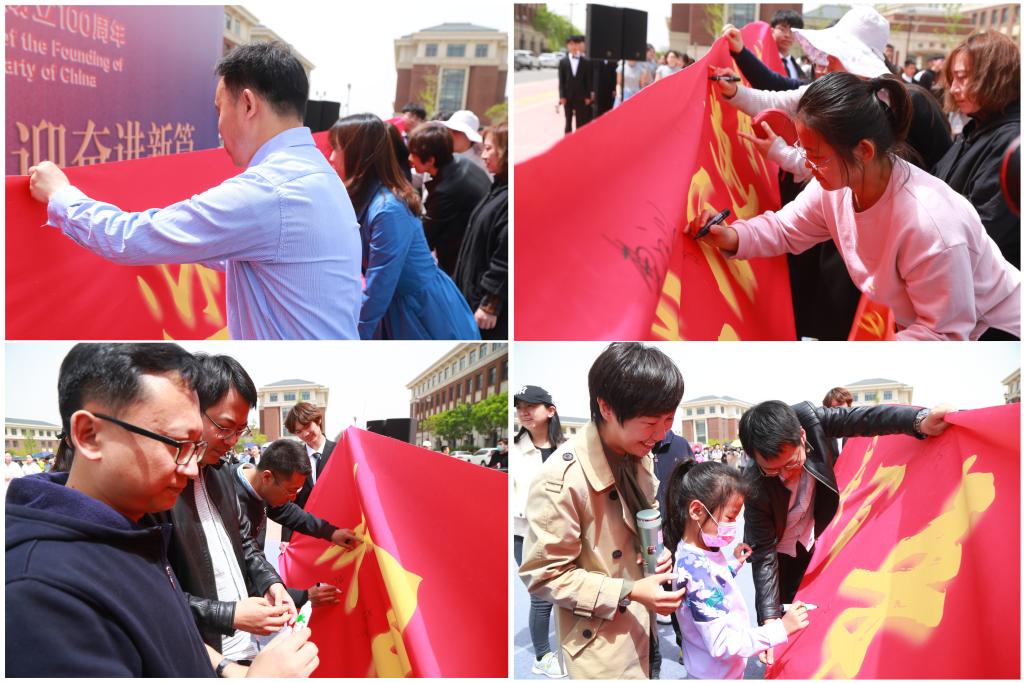 伴随着红色横幅缓缓展开,“庆百年峥嵘 迎奋进新篇”十个大字映入师生眼帘,师生纷纷签名并合影留念。笛声伴奏,乐器演奏,太极剑展示,在广场上共同传扬民族传统运动的博大精深。一个个大卷轴、小卷轴徐徐拉开,师生们齐书百年图卷,共谱时代华章。