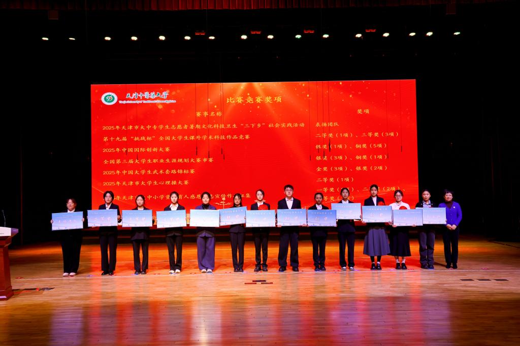 表彰大会上,校党委副书记张华泉宣读了《关于表彰天津中医药大学2025年优秀学生及先进集体的决定》。在即将过去的2025年,我校学生坚定理想信念、加强品德修养、夯实专业技能、陶冶道德情操、增长本领见识,躬耕实践,奋楫争先,在各类学科竞赛、专业竞技、评奖创优中取得了优异成绩,充分彰显了天中学子的优秀综合素质。为选树典型、表彰先进,充分发挥学生榜样的示范引领作用,学校领导为获奖学生代表颁奖表彰。