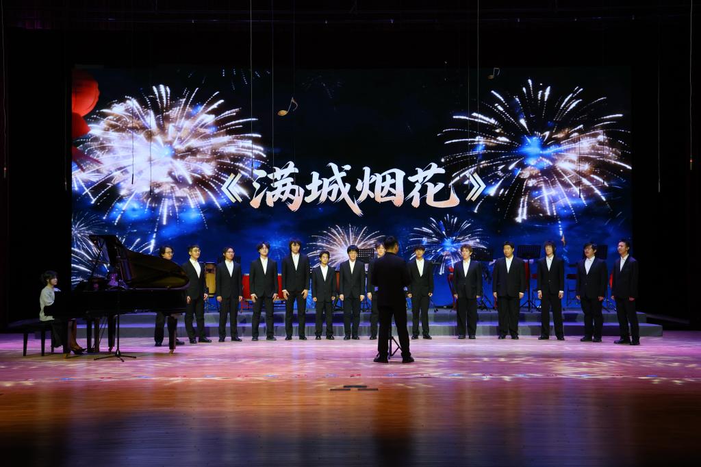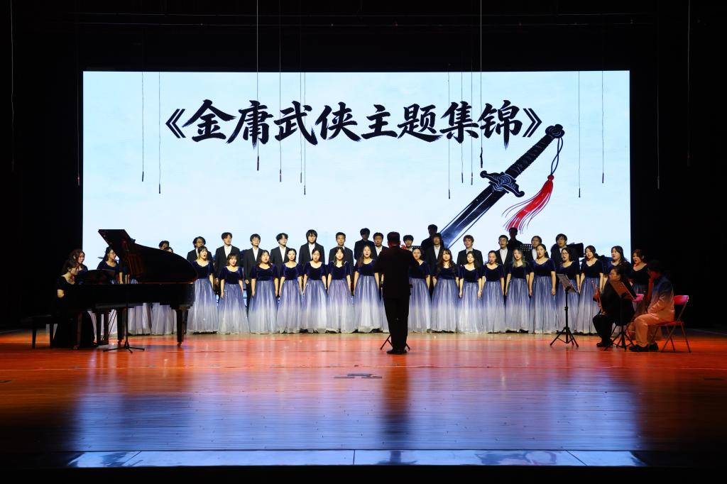在第二篇章,大学生合唱团献上《满城烟花》《冰雪奇缘》组曲与《金庸武侠主题集锦》三首佳作。从《满城烟花》中阖家团圆的温馨暖意,到《冰雪奇缘》组曲里充满奇幻色彩的童话世界,再到《金庸武侠主题集锦》中快意恩仇的江湖侠义与朝气蓬勃的青春情怀,合唱团以精湛的多声部交织技巧,层层递进地传递出丰富情感,充分展现了合唱团扎实的演唱功底与多元的艺术表现力,每一个音符都直抵人心,赢得现场阵阵掌声。