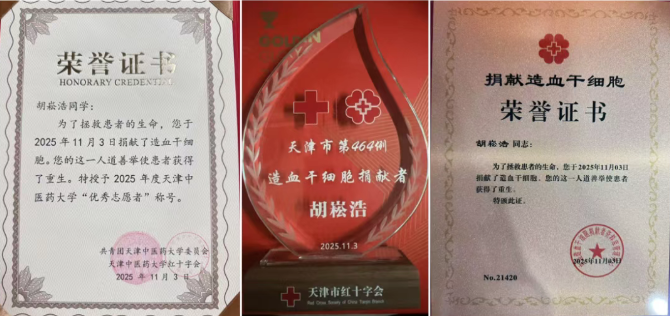 胡崧浩的事迹里,没有惊天动地的宣言,只有扎根日常的坚守与发自内心的善意。捐献当天,学校领导老师与天津市红十字会工作人员专程前往医院探望,为他颁发“优秀青年志愿者”荣誉证书和纪念奖章。面对满溢的赞誉,他始终保持着一份纯粹的平静:“我只是做了一名医学生该做的事。”他坦言,捐献过程中学校领导老师的关怀、父母的支持、舍友的轮流陪护,都是他前行的力量,这份荣誉应该属于每一个传递大爱的人。