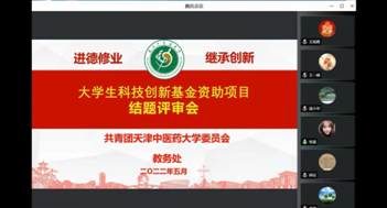 我校第十一届大学生科技创新基金项目于2021年4月立项,共资助学生创新创业项目86项(市级、国家级42项)。经过一个研究周期,各项目已于近期陆续完成研究工作。为检验项目的完成情况并对学生的研究成果进行评估。经过前期广泛调研,结合疫情防控实际情况,校团委联合教务处整合资源于5月22日召开线上结题评审会。来自17名各领域专家担任评委,分别为自然科学类:宋丽丽、蔡青、谢盈彧、王海霞;科技发明类:王强、庄朋伟、王一婧;哲学社科类:韩晓捷、陈红梅、李艳;中医经典传承类:孟静岩、郝征、邵琳琳;创业类:张春梅、王艳、宋正刚、杨一丹。